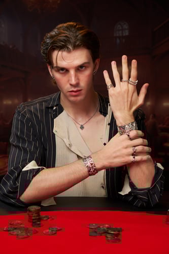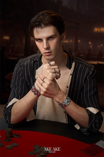 888 เลข 8 ลุ่มหลงมัวเมาทายราหู เป็นเลขประจำคาสิโน สื่อถึงความลุ่มหลงในงานศิลปะทำมือของเอกเอกที่ครั้งนี้แกะซ่อนลายโมทีฟประจำแบรนด์ Fierce-de-lis ออกมาเป็นลายหน้าไพ่ทั้ง 4 ได้อย่างปราณีตและละเอียดสุดบรรยาย