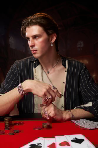 888 เลข 8 ลุ่มหลงมัวเมาทายราหู เป็นเลขประจำคาสิโน สื่อถึงความลุ่มหลงในงานศิลปะทำมือของเอกเอกที่ครั้งนี้แกะซ่อนลายโมทีฟประจำแบรนด์ Fierce-de-lis ออกมาเป็นลายหน้าไพ่ทั้ง 4 ได้อย่างปราณีตและละเอียดสุดบรรยาย